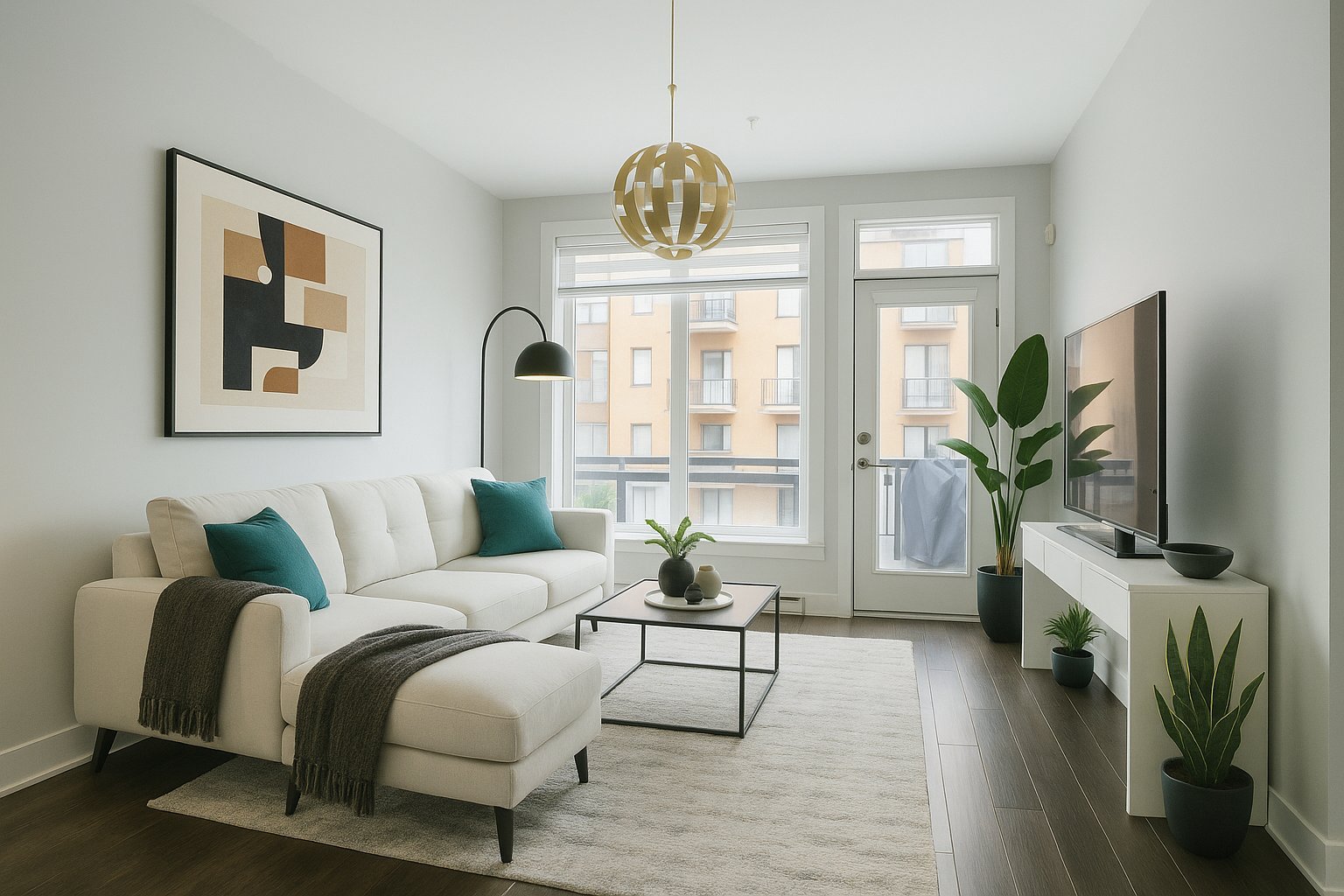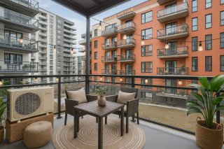Inclus : Luminaires, rideaux, stores, ensemble de table avec 4 chaises extérieur (balcon)